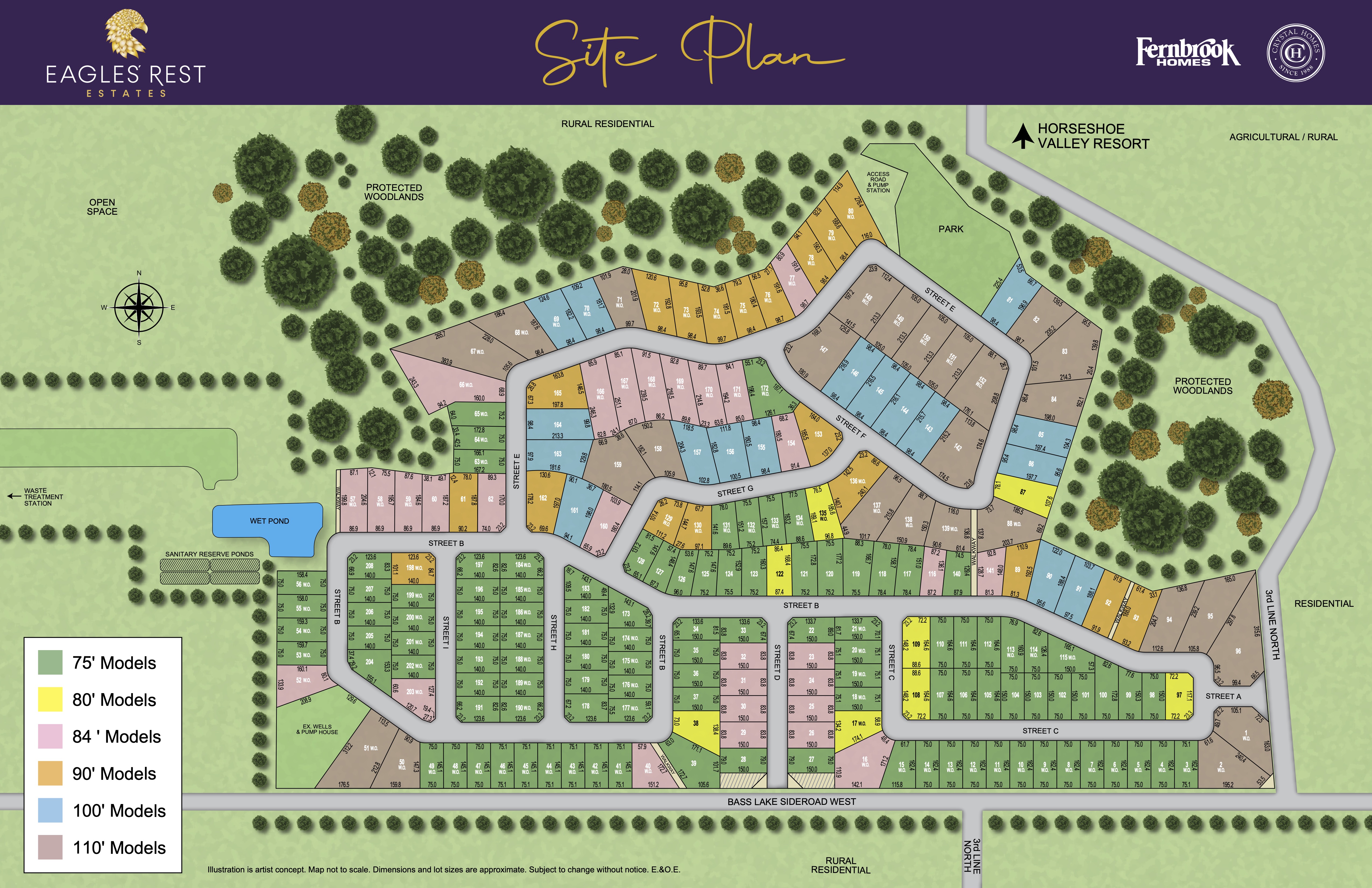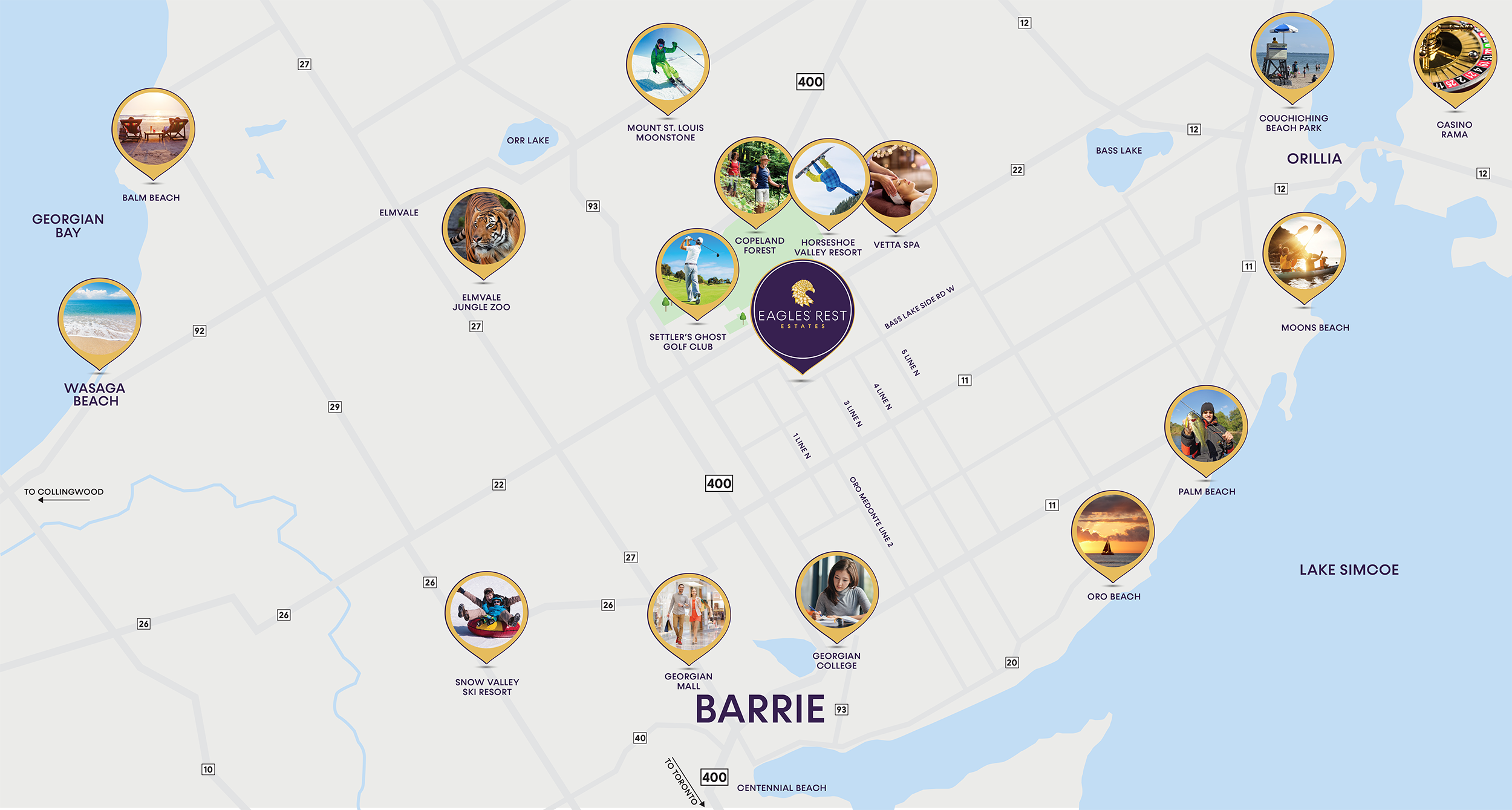 Eagles’ Rest Estates is an exclusive enclave of luxury homes surrounded by protected forest, rolling hills, and serene countryside. With lot sizes ranging from 75’ to 110’ wide and high-speed internet, municipal water/sewer services, and proximity to Horseshoe Resort, The Heights Ski Club, and the Nordic Spa, this is where nature and luxury meet. Only 10 minutes to Barrie and 40 minutes to the GTA, this location offers both a peaceful retreat and convenient access to urban amenities.